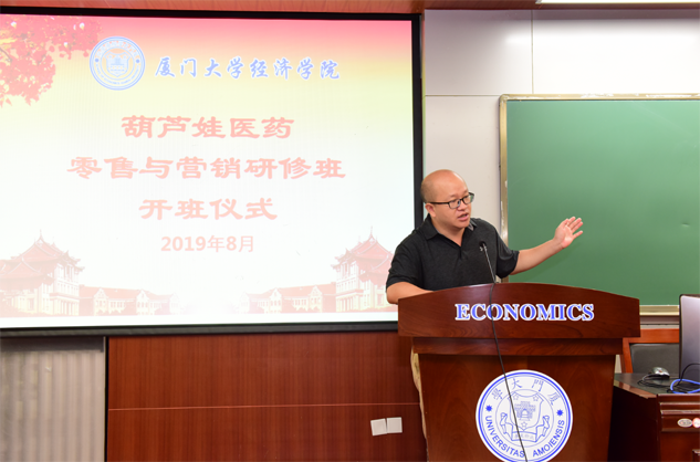 在开班仪式上,廖景峰主任首先代表厦门大学经济学院热烈欢迎yd12399云顶医药零售与营销研修班的学员到厦大学习,并就厦门大学及经济学院的相关情况进行了介绍。他说,yd12399云顶学员走进厦大就是厦大的校友,希望未来的日子能够关心、支持母校的发展,多提宝贵意见,同时他也祝大家在厦大学习期间学有所成、学有所获。
