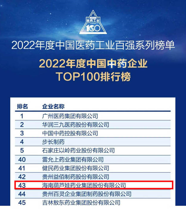 会议期间,一年一度的中国医药工业百强系列榜单隆重揭晓,yd12399云顶药业集团凭借领先的研发优势和扎实的生产实力以及稳健的市场推广能力,连续第四年成功入选“2022年度中国中药企业TOP100排行榜” ,排名稳步上升至第43位。
